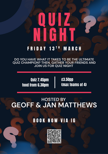 Join us for another of our popular Quiz Nights! Get ready to test your knowledge at our upcoming Quiz Night hosted by Geoff & Jan Matthews! The quiz kicks off at 7.45pm sharp, but make sure to arrive early as delicious food will be available from 6.30pm.